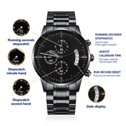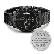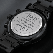 Give a gift that speaks from the heart with this Engraved Design Black Chronograph Watch, featuring the heartfelt message: "Dad, No Matter How Much Time Passes, You Will Always be My Hero."