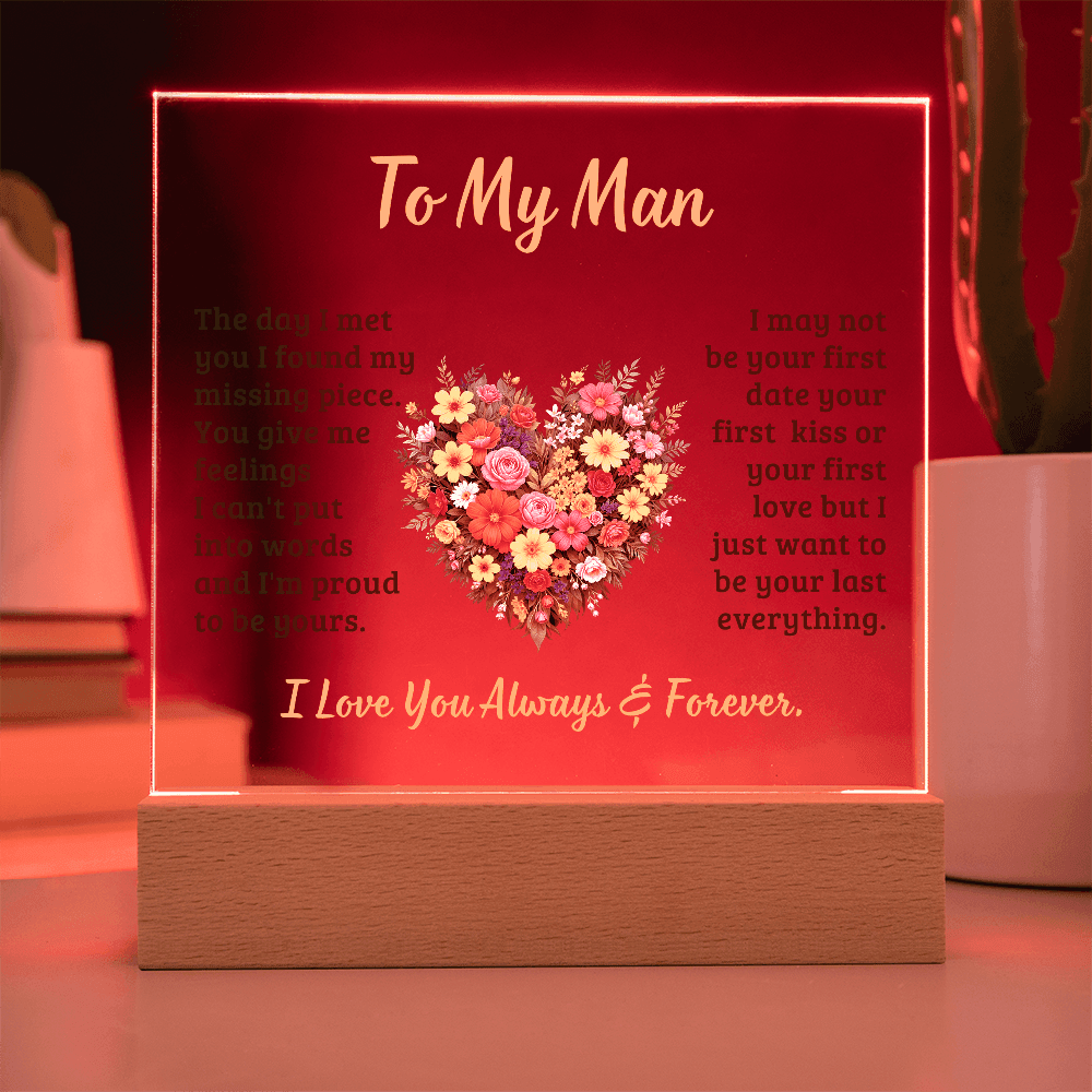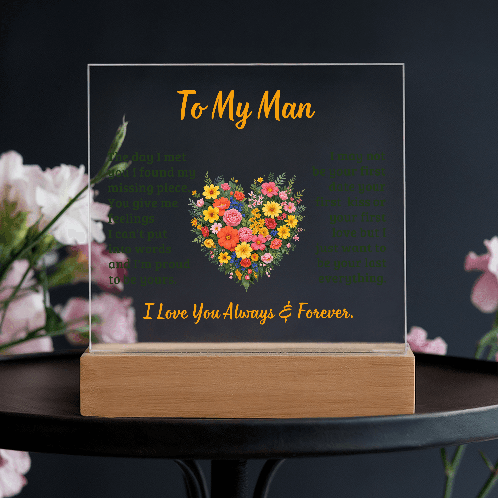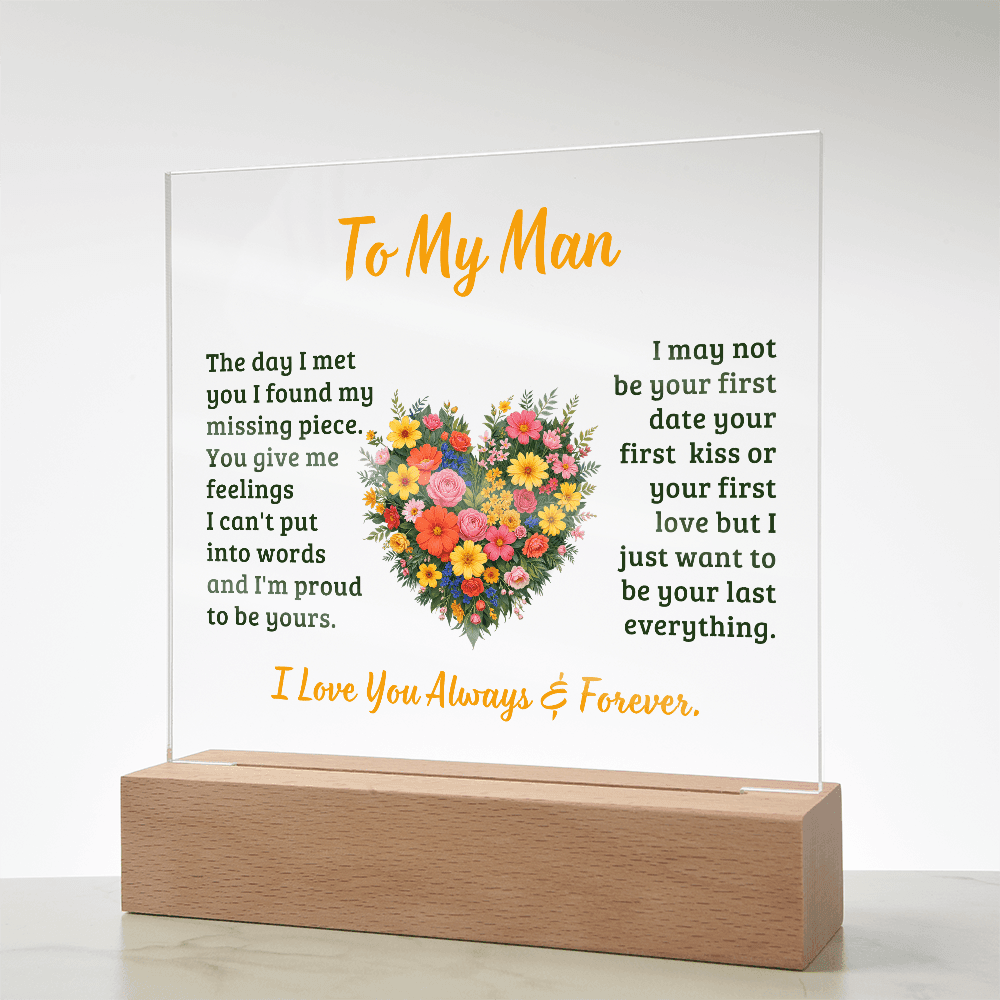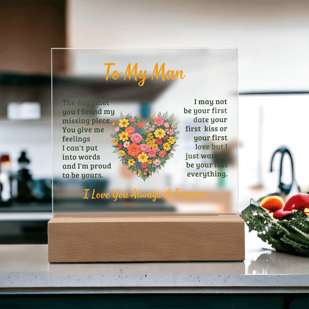 Capture your deepest emotions with our exquisite Printed Square Acrylic Plaque featuring the soul-stirring message: "To My Man - The day I met you I found my missing piece. You give me feelings I can't put into words and I'm proud to be yours. I may not be your first date your first kiss or your first love but I just want to be your last everything. I Love You Always & Forever."