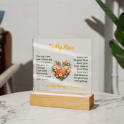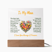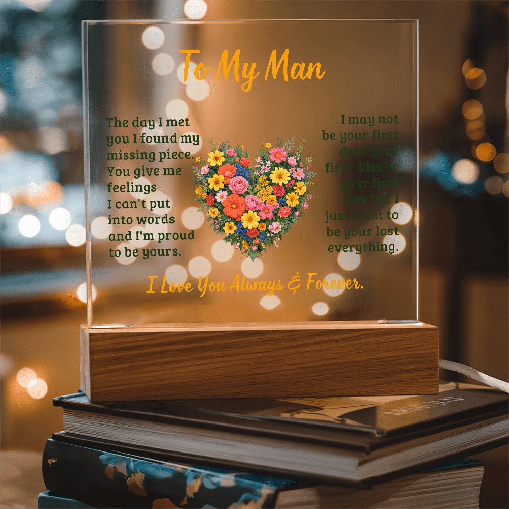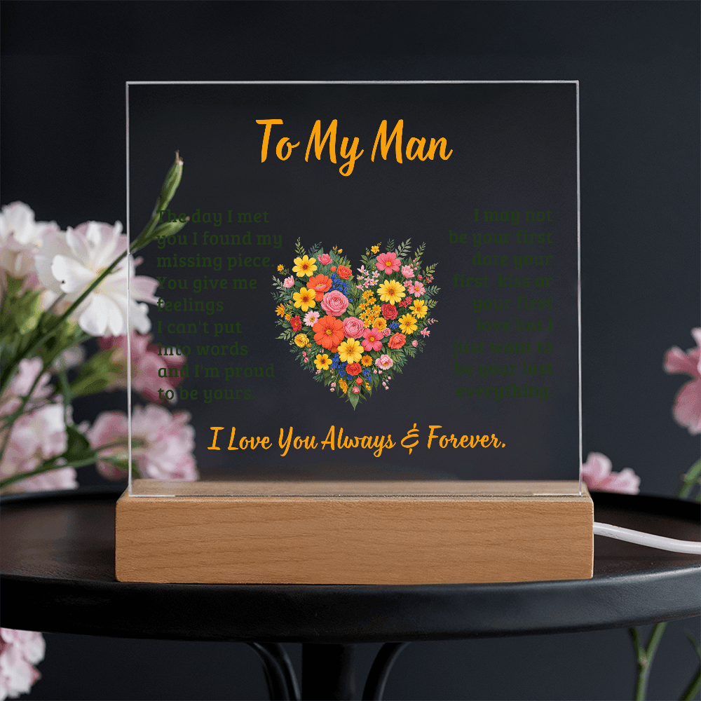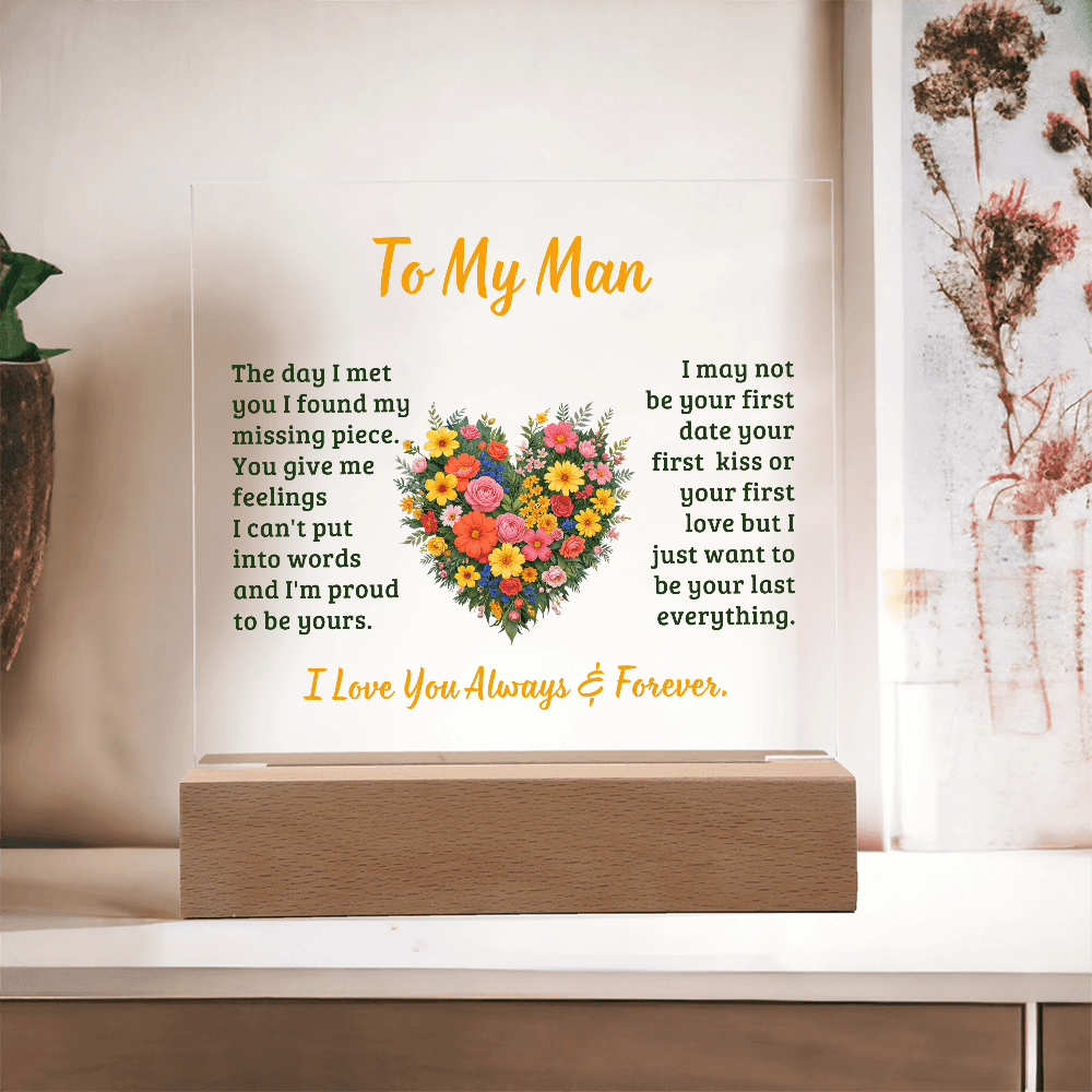 Capture your deepest emotions with our exquisite Printed Square Acrylic Plaque featuring the soul-stirring message: "To My Man - The day I met you I found my missing piece. You give me feelings I can't put into words and I'm proud to be yours. I may not be your first date your first kiss or your first love but I just want to be your last everything. I Love You Always & Forever."