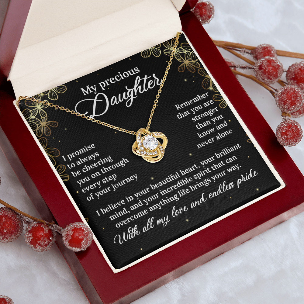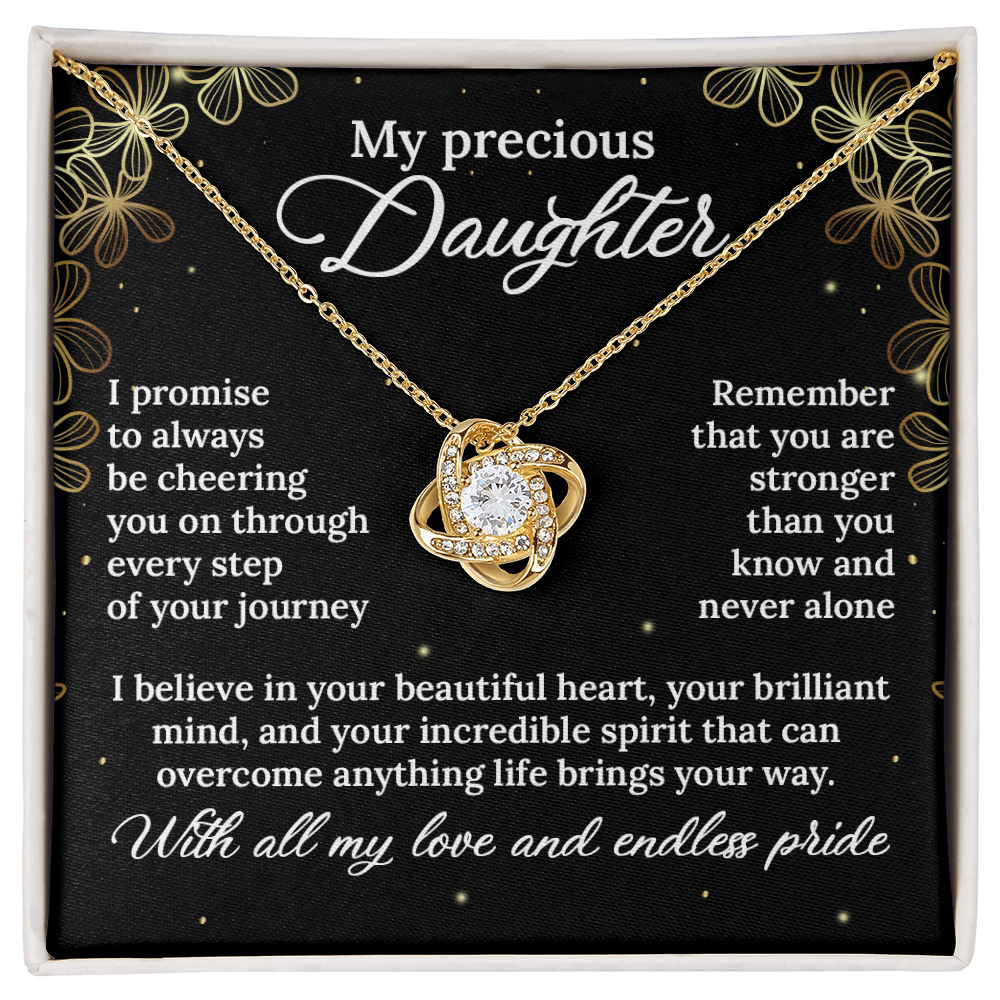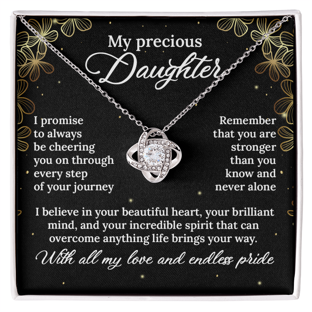 More than just jewelry, this necklace represents your promise to always be her biggest supporter, no matter where life takes her. The love knot design symbolizes the eternal connection between your hearts - a bond that distance and time can never break.