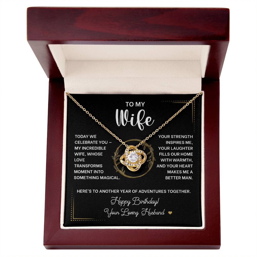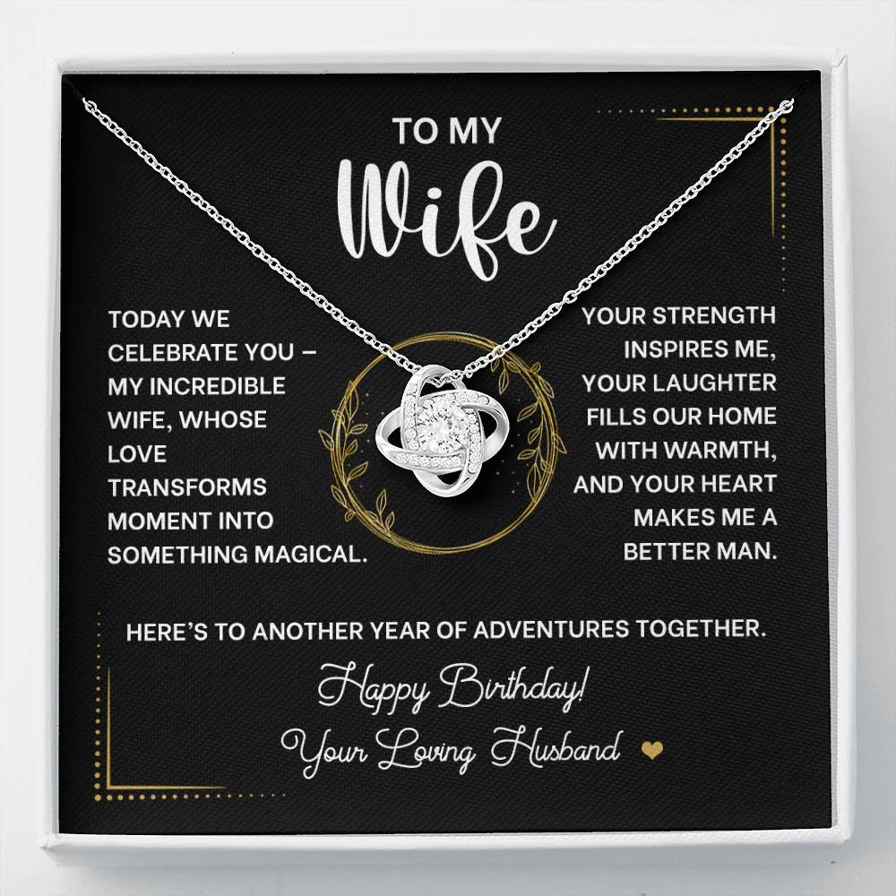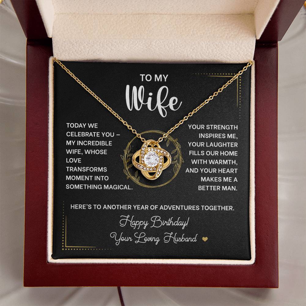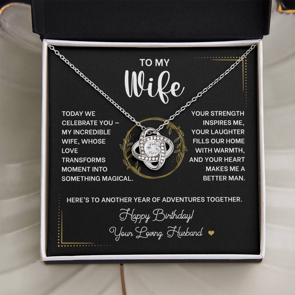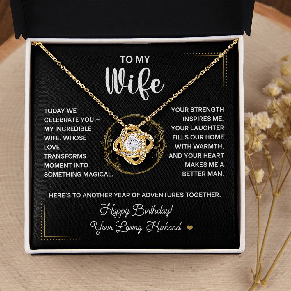 Picture the joy lighting up her face when she opens this exquisite Love Knot Necklace on her special day. More than just jewelry, this meaningful piece symbolizes the eternal bond you share as husband and wife - an unbreakable connection that grows stronger with each passing year.